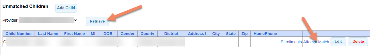 2. Click "Retrieve" and click “Attempt Match” next to the unmatched child’s entry,