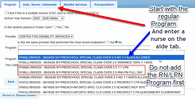 If a child will attend Center-based classes with a nurse (RN/LPN), a special set of steps needs to be taken by both the district and the county. This is because SED categorizes RN and LPN aides as special programs and requires the STAC-812 form.