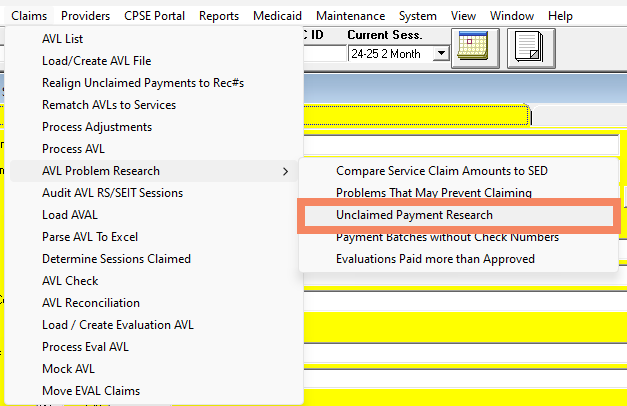 First, to cover the basics, the work for researching unclaimed payments is done in "Claims" -> "AVL Problem Research" -> "Unclaimed Payment Research".