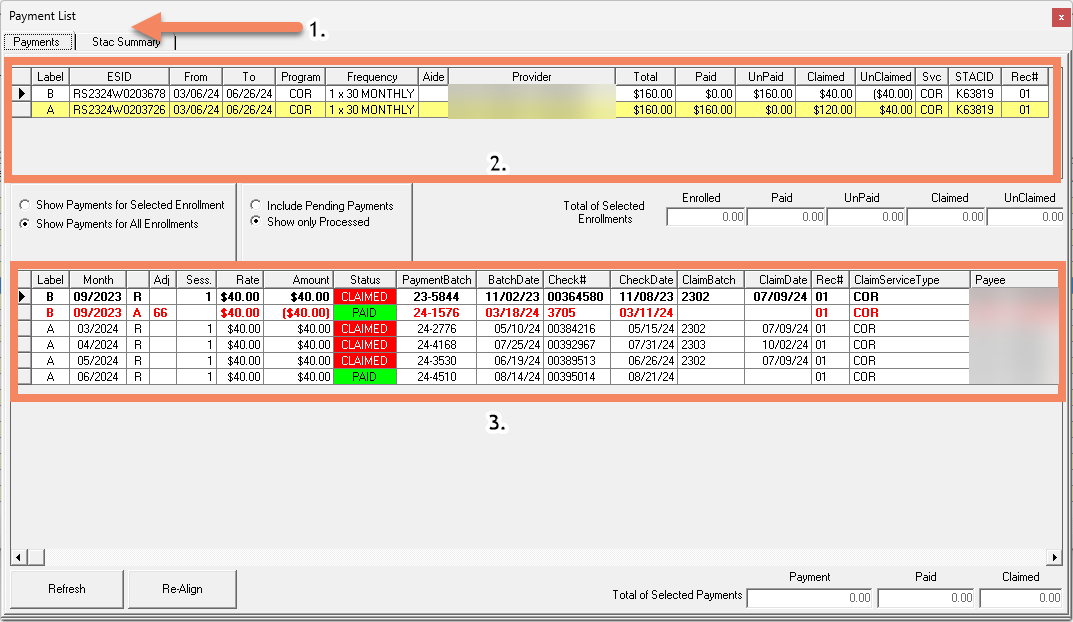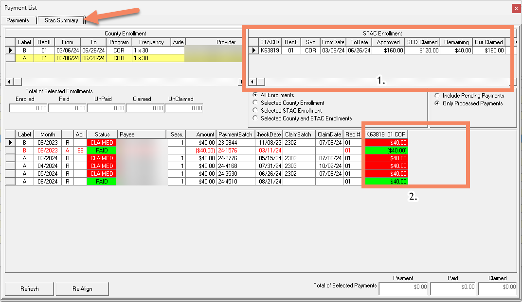 1. A payment listing window has two tabs: the "Payments" tab shows more enrollment details, and the "STAC Summary" tab shows more STAC details.