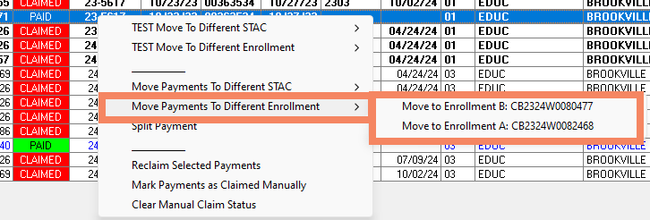 Move Payments to Different Enrollment: This will move the payment to another enrollment, while remaining on the same STAC.