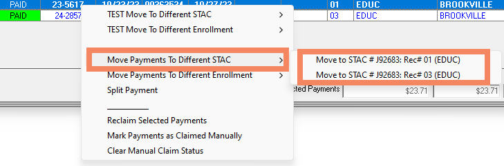 Move Payments to Different STAC: This will move the payment to another STAC record, while remaining on the same enrollment.